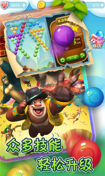 《熊出没之泡泡大战》是一款以经典卡通动漫《熊出没》为原型的休闲益智游戏。游戏中,玩家将与熊大、熊二一起迎接新的挑战,通过射出相同颜色的泡泡来消除天空中不同颜色的泡泡。游戏画面采用萌萌哒画风,色彩鲜艳,场景细腻,操作简单易上手,特别适合用来打发时间。