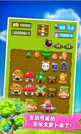 1. 合体升级:玩家需要将相同的元素进行合体,以获得更高级的物品和建筑,提升村庄的繁荣度。四个以上相同的萝卜合体后会变为3倍的大萝卜。