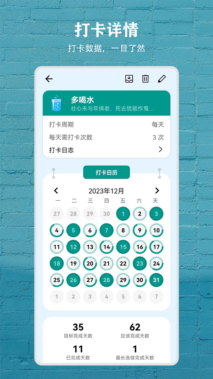 2. 进度追踪:通过日历视图或图表形式,清晰展示用户每个习惯的完成情况,便于自我监督和调整。