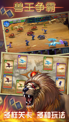 4. 战斗操作:把卡片拖拽到屏幕上开始战斗,左右滑动可以查看战场情况。根据敌方派出兽王的路线来派出兽王应战,控制战线以形成有利局面。