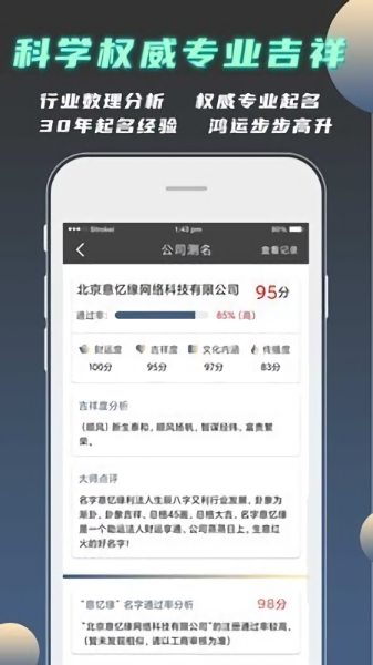 公司起名测名大全是一款专为创业者、企业家及品牌策划人员设计的实用工具软件,旨在帮助用户快速、准确地为公司、品牌或产品起一个寓意深远、易于记忆且符合市场定位的名称。
