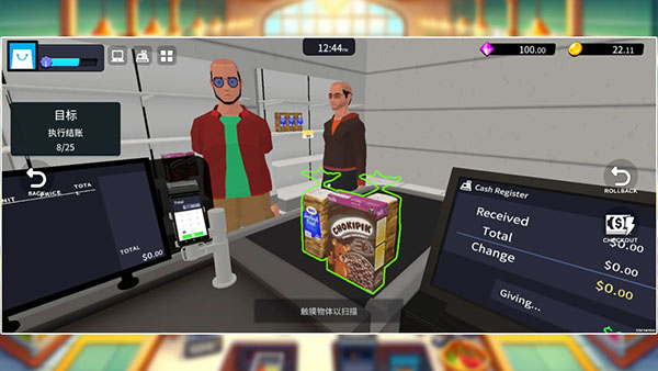 2. 定价与销售:给商品定价后开始营业,顾客选择好商品后点击商品进行结账,玩家需要处理现金和卡支付,并找零。