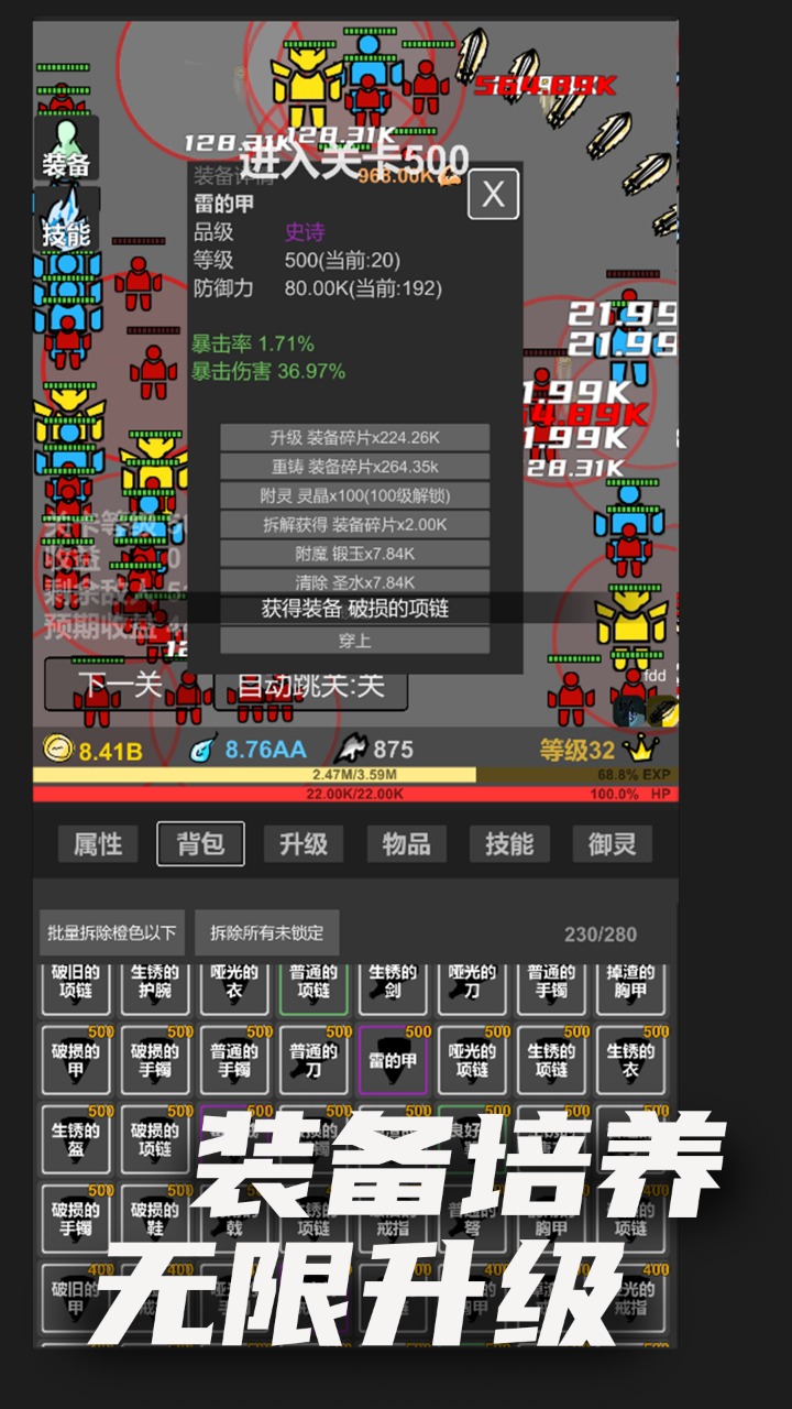 1. 无限升级系统:游戏采用独特的无限升级机制,让玩家能够不断提升自己的实力,挑战更高难度的关卡。