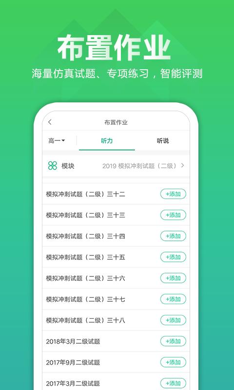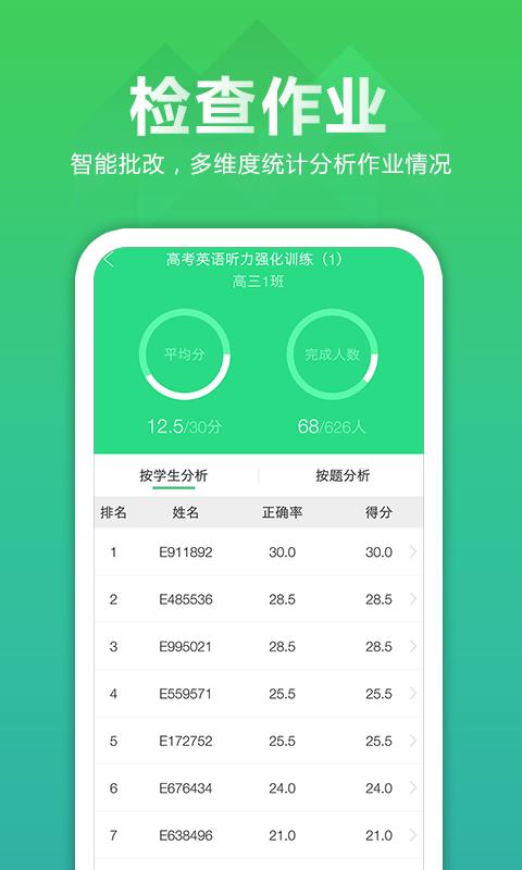 听力百分百教师端app是教师辅导学生学习英语口语的一款应用;教师通过软件可以在线创建班级,智能管理班级内的每一位学生,线上布置家庭作业,让学生在学习的同时不断练习,这样才可以增加学生学习知识的印象,学习到更多知识;,听力百分百教师端app可以在线创建班级,智能管理班级内的每一位学生,线上布置家庭作业,让学生在学习的同时不断练习。学生的学习情况一目了然,考勤情况,听课状态、完成作业的情况等都可以在软件中查看到,让管理学生变得更高效,针对不同学生的学习情况看改变授课策略,让每一位学生都可以学习到更多的英语知识,提高学习成绩,欢迎有需要的朋友下载软件使用,便捷查看学生的学习情况;