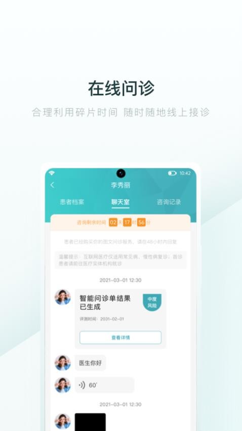 3. 问诊记录:应用会自动保存医生的问诊记录,方便医生随时查看和回顾患者的病情和诊疗过程。