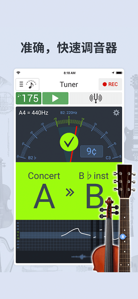 2. 精准调音功能:通过半音调音器(Chromatic Tuner)和音叉(Tuning Fork)两种模式,软件能够精准测量声音音调和强度,帮助用户快速调音。