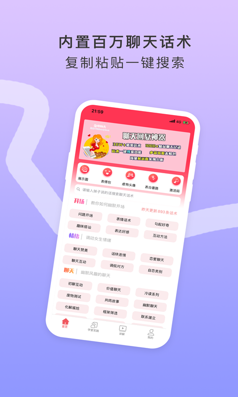 恋爱话术宝聊天话术神器通过大数据分析和人工智能技术,整合了众多成功的恋爱案例和沟通技巧。用户可以通过搜索关键词或场景,快速找到适合自己的聊天话术和应对策略。同时,软件还提供实时更新功能,确保话术库的时效性和实用性。