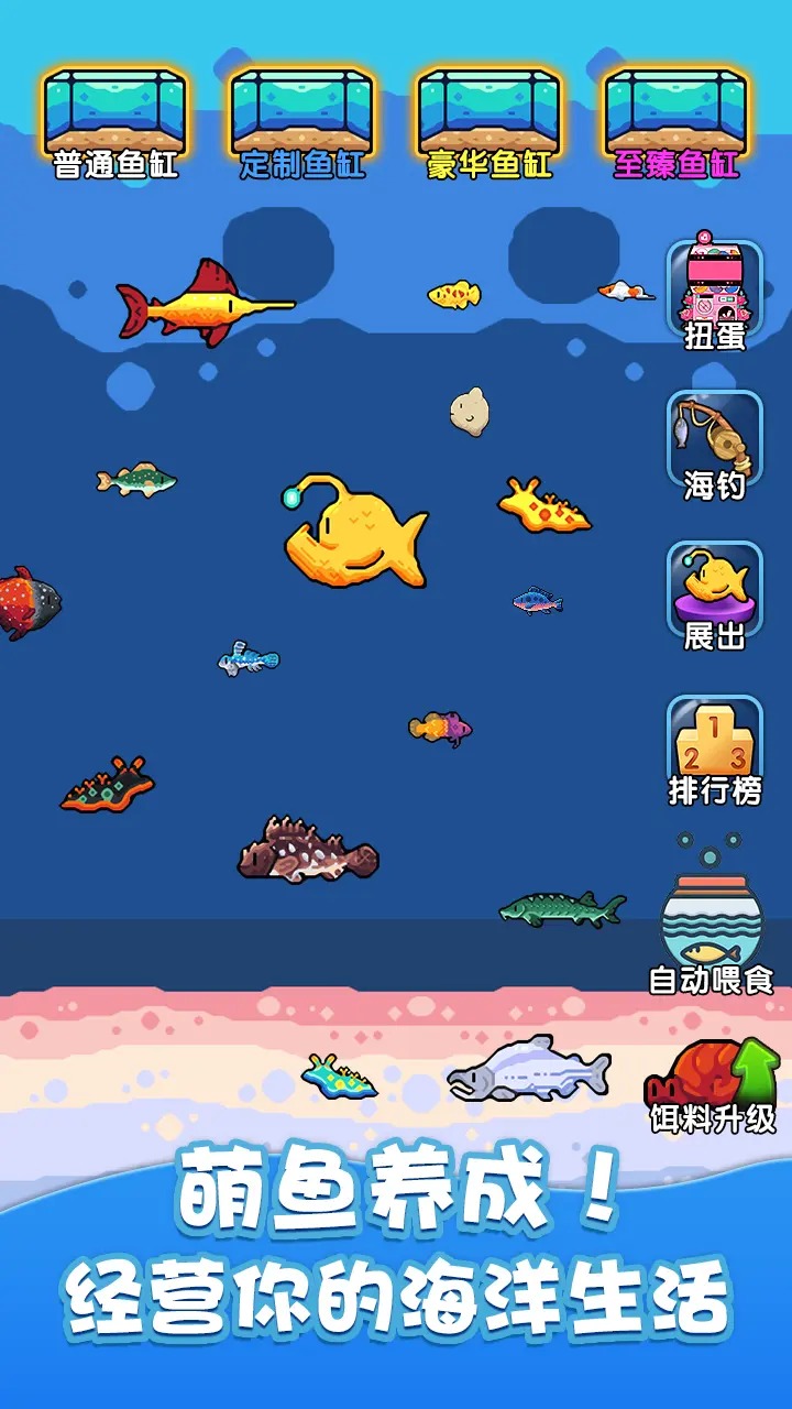 2. 水族箱设计:玩家可以自由设计自己的水族箱布局,包括选择背景、装饰物以及植物等,打造一个独一无二的水下世界。