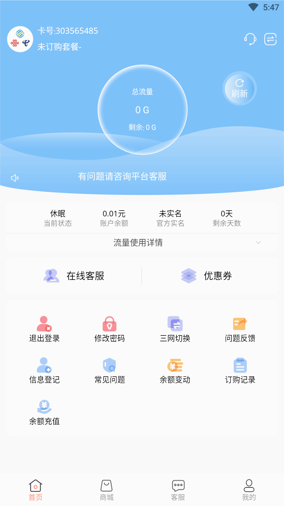 1. 流量查询:实时查看当前流量使用情况,包括已用流量、剩余流量及套餐详情。