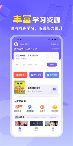3. 自主学习:在首页的“新标准同步学”专区中,按教材章节进行学习,通过“课本点读—词汇跟读—词汇练习—课文动画—课文朗读—同步练习—趣味配音”的流程,全面掌握教材内容。