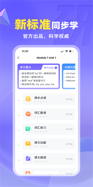 1. 同步教材:外研U学学校版无缝衔接外研社《新标准》正版教材,提供与教材同步的课文点读、词汇跟读、词汇练习等功能。