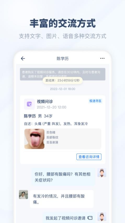 2. 在线问诊:医生可以在线与患者进行文字、语音或视频通话,进行远程诊疗,为患者提供及时的医疗建议。