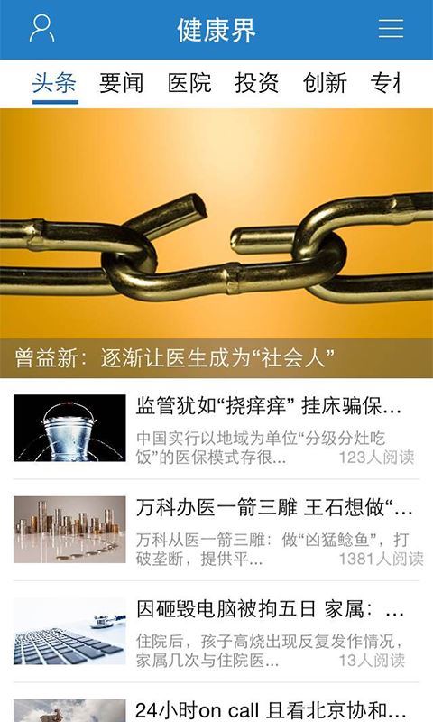 健康界app是一款医疗健康资讯阅读软件,资讯内容涵盖了医疗健康的各个方面,包括医学界新闻、各大医院变化信息、医疗事业投资信息以及新颖的医疗手法和健康专栏作者文章等,可谓是涉及到了医学相关的各个行业。现在随着生活水平的提高,用户朋友对自己的健康状况也越来越关心了。这款健康界免费版是一款专为用户朋友设计的健康生活app,用户朋友在日常的生活中有什么医疗内的问题或麻烦可以在平台上通过,专家进行咨询,用户朋友就不用去医院了,非常方便的一款小助手。