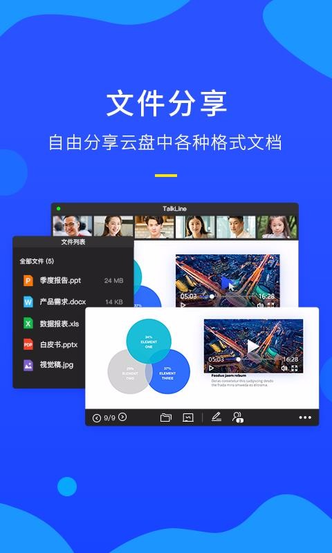 【文件分享】自由分享个人与企业云盘中的Office、PDF、图片等各种格式文档,多端可同时对内容标注说明,亦能同步播放多路音视频文件,交流演示如此生动。