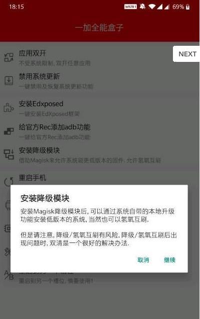 一加全能盒子支持多种一加手机型号,并需要手机开启root权限方可操作。软件提供了丰富的功能,包括但不限于双开应用、禁用/恢复系统更新、一键刷机、安装EdXposed/Magisk等,满足用户对于手机个性化设置和优化的需求。
