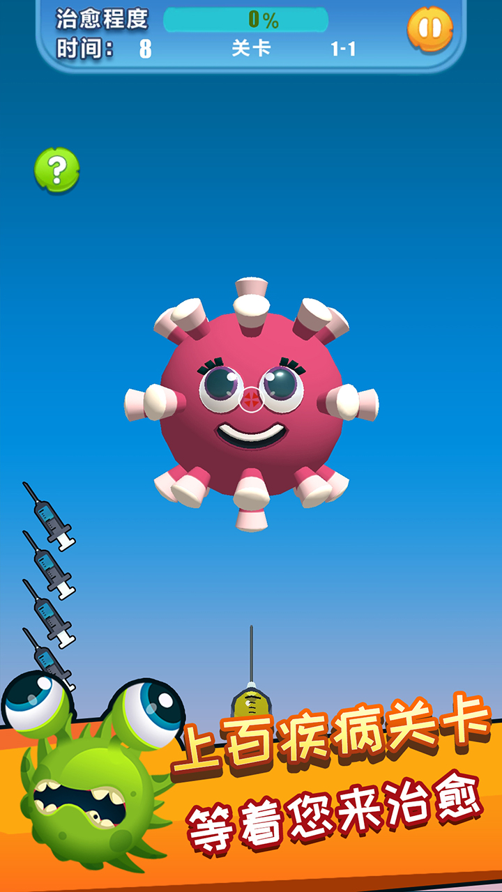 不断闯关完成关卡,战胜细菌,就能获得针筒皮肤。不论是少女心爆棚的魔法少女,还是干练帅气的暗部忍者,都将成为你的武器!