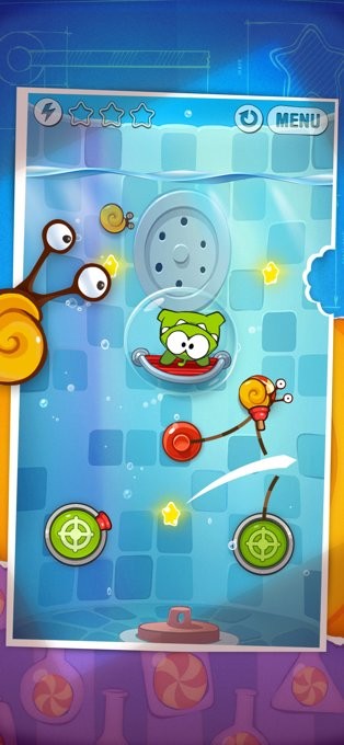 1. 游戏目标:玩家的主要任务是帮助小怪兽Om Nom吃到糖果。每个关卡中,糖果通过绳子悬挂,玩家需要巧妙地切割绳子,利用重力、惯性等物理特性,让糖果落入Om Nom的口中。同时,尽可能多地收集星星,星星是解锁后续关卡的重要道具。