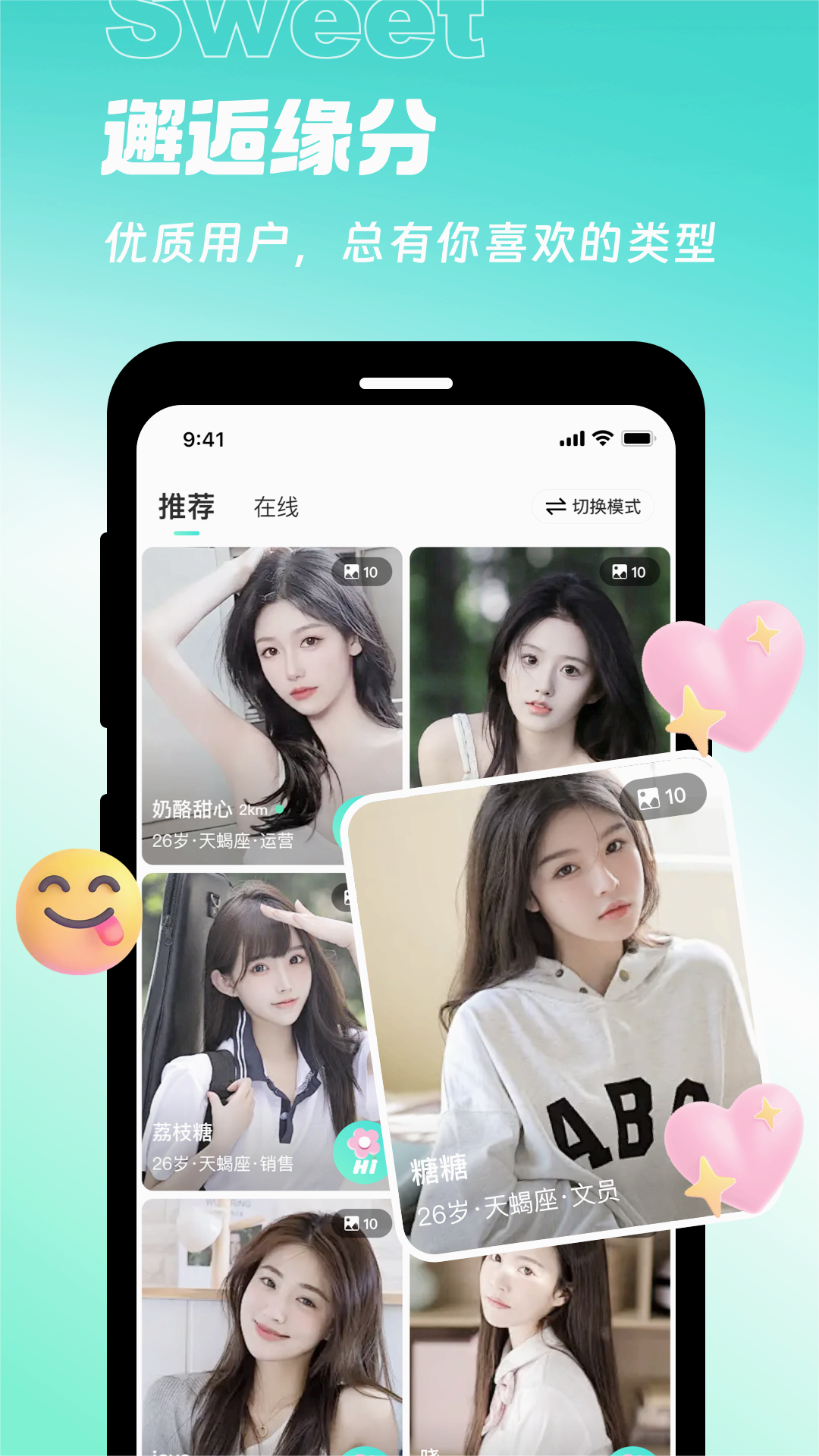 甜意通过智能化的匹配算法和丰富的情感表达工具,为用户打造一个温馨、真诚、富有情感的社交网络。在这里,用户可以发布自己的心情日记、小故事或感悟,与志同道合的人分享,同时也能浏览他人的分享,寻找心灵的慰藉和共鸣。
