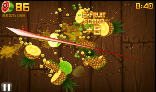 3. 切割水果:用手指在屏幕上滑动,切割飞出的水果。注意避免切割到炸弹,否则游戏结束。