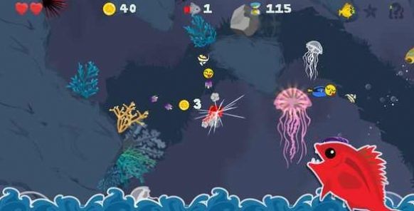 小红鱼体型微小,需谨慎躲避鲨鱼、水母等天敌,优先吞噬浮游生物与小鱼苗积累能量。
