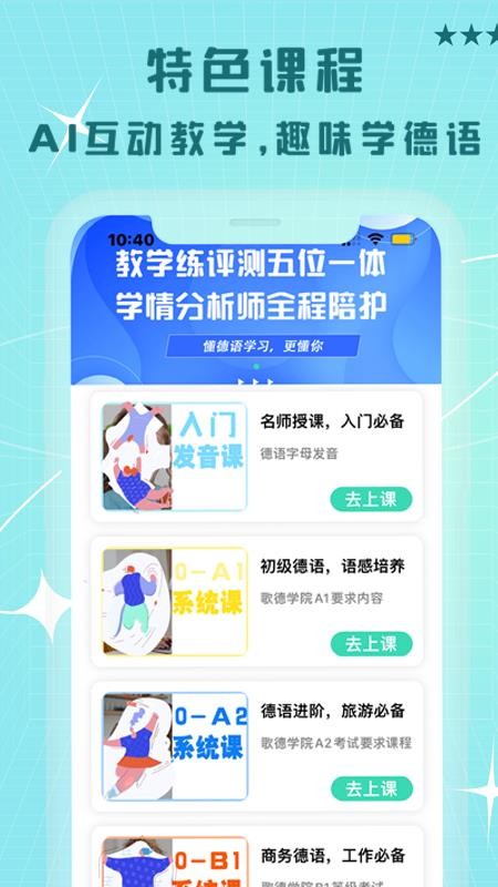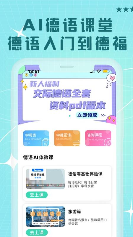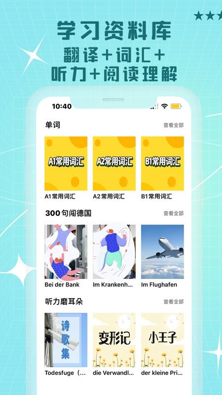 - 场景化学习:300句时事新闻原声例句、旅游常用语、德国文化兴趣课(歌剧、电影、生活用语等)。