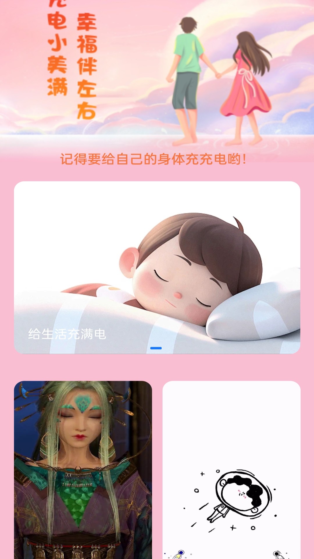 - 充电壁纸库:包含静态高清图与动态视频壁纸,支持按分类(风景、卡通、科技)筛选。