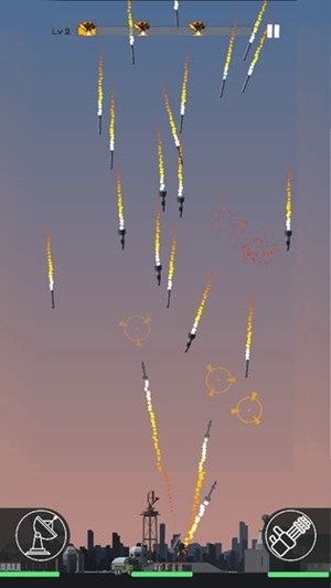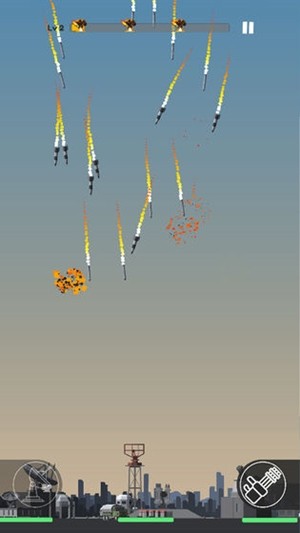 场景随等级提升解锁,导弹数量与速度递增。例如,第七关新增可拐弯的导弹,后期关卡更密集的弹道考验玩家手速与预判能力。