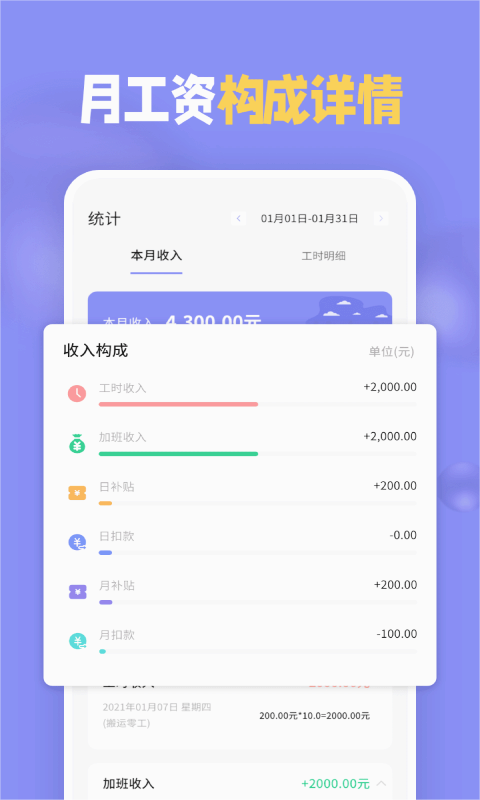 显示月累计收入、平均时薪、加班总收入等关键指标,支持按周/月/年切换视图。