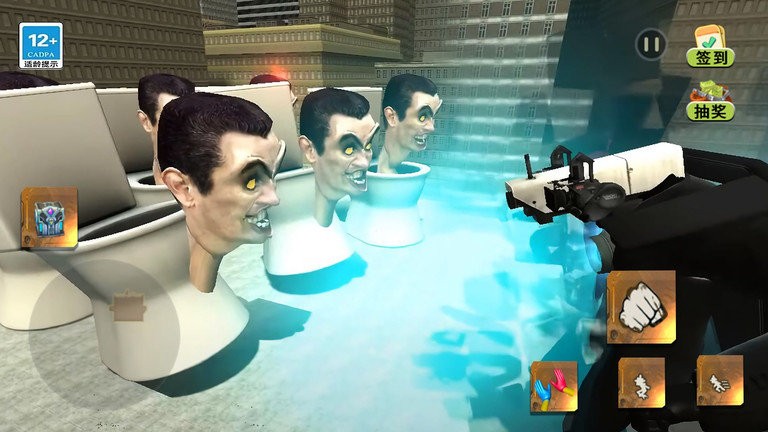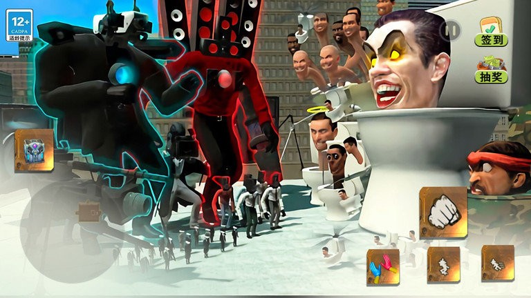 2. 高自由度角色成长:角色技能树与装备系统深度绑定,满级角色可组合技能形成独特战斗风格。如“喷射马桶人”可通过技能组合实现空中连击,搭配能量护盾提升生存率。