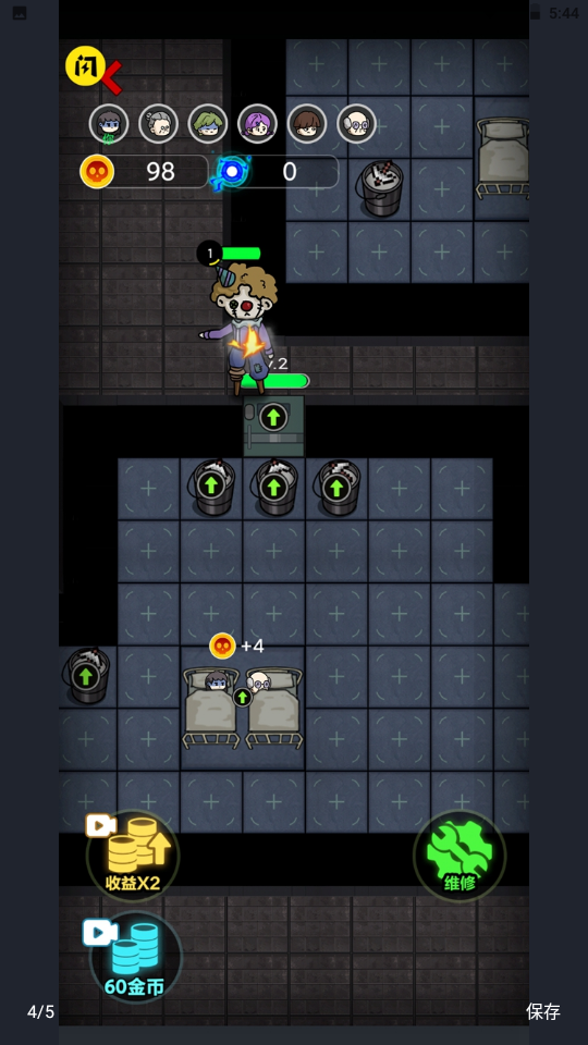 2. 资源管理:通过升级床获取金币,建造游戏机生成电力,利用电力购买矿石提升金币产出效率。优先升级门防御鬼怪,后期建造维修器自动回血。