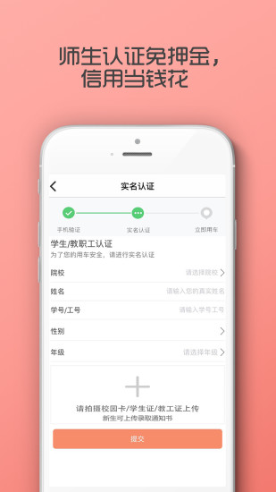 1. 免押金认证:师生完成身份认证后即可免押金用车,信用当钱花,降低使用门槛。