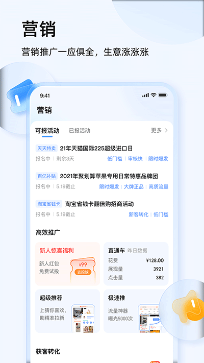3. 营销推广:提供优惠券发放、营销活动创建、直通车管理等工具,帮助卖家进行精准营销和推广。