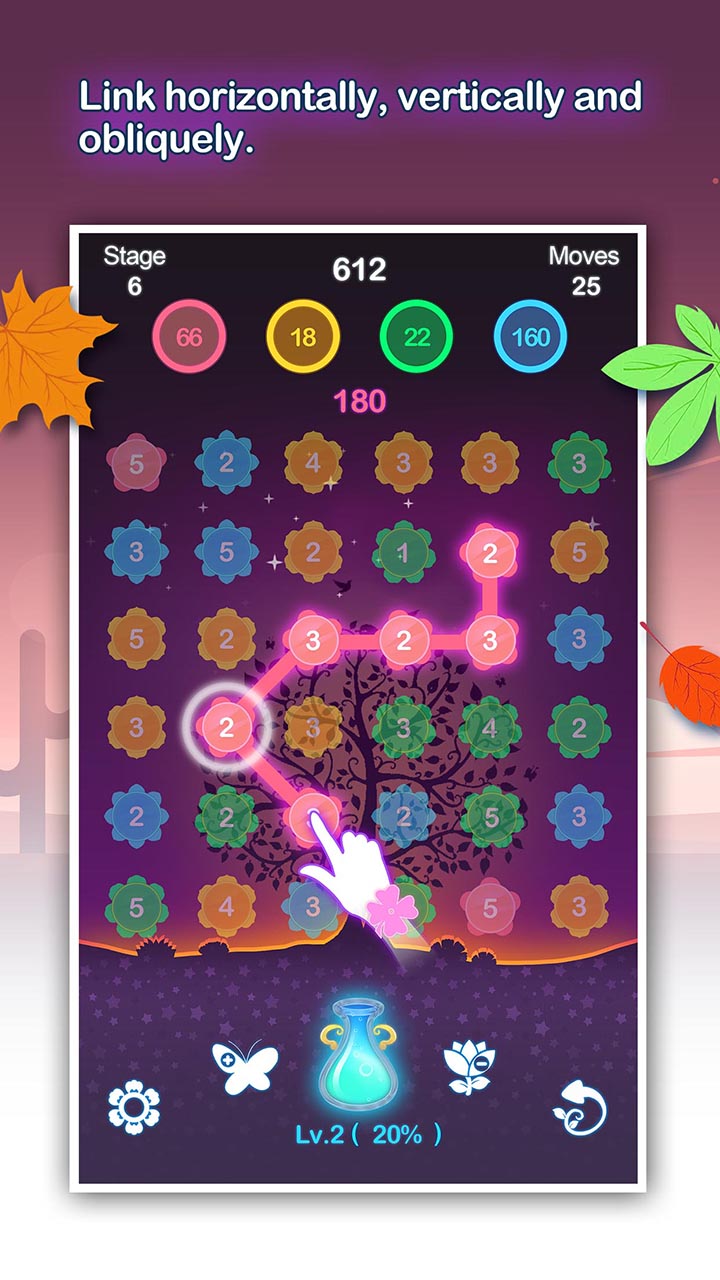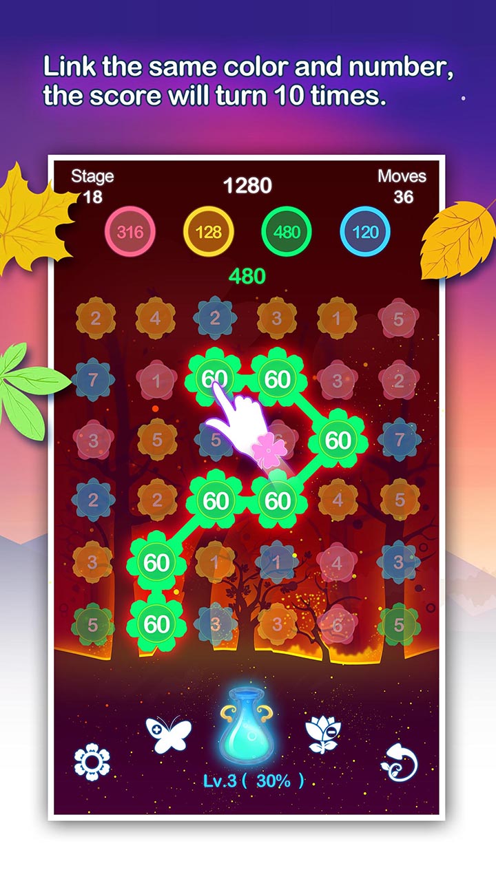 基本的双重三连消规则,即颜色和数字的双重匹配三消。当颜色和数字达到双重匹配时,花朵上的数字会翻10倍,消除得分也会10倍。