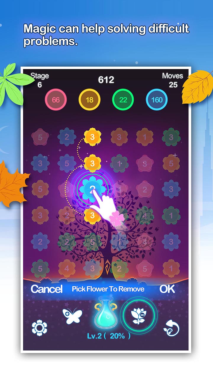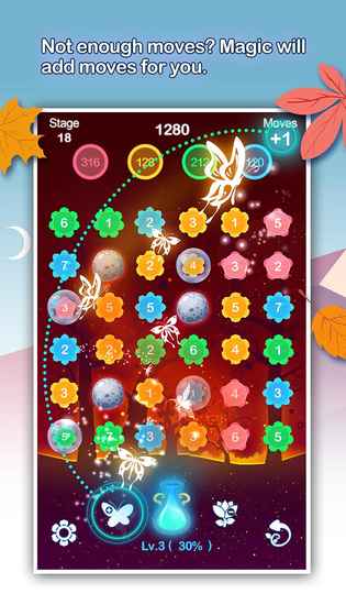 当宝瓶收集满了,会激活两个魔法,魔法1可以为你增加一步。魔法2可以减去一朵碍事的花。合理利用这两个魔法,可以在关键时刻帮助你。