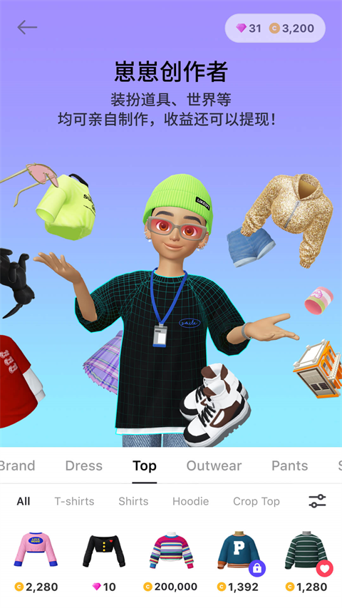 崽崽Zepeto免费版支持用户自由定制自己的虚拟形象,包括发型、服装、表情等,提供了丰富的素材和道具供用户选择。此外,用户还可以探索虚拟社区,与其他用户的3D角色进行互动,如打招呼、送礼、一起玩游戏等,营造了一个充满乐趣和创意的虚拟社交环境。
