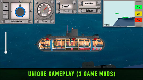 1. 基本操作:通过屏幕上的虚拟按键控制潜艇的上下左右移动和深度调节。