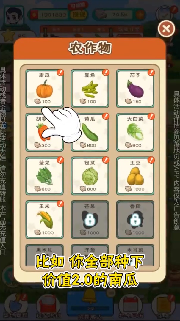 2. 土地规划:利用获得的金币购买田地、装饰物,规划自己的农场布局。