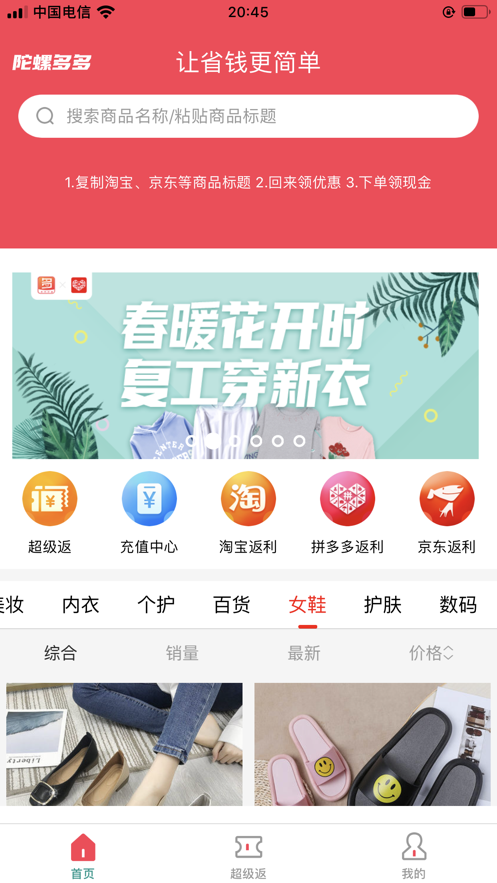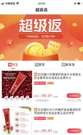 2、超级返利不容错过,随时都能查找拼多多、天猫、淘宝等平台的商品,网上购物安全贴心。