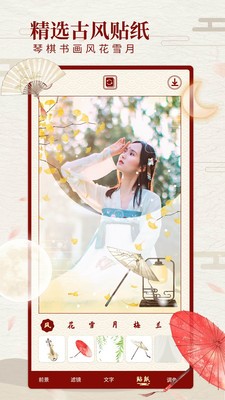 尺素古风相机app是刚出来一款非常古风的拍照软件。告别过度的微晶换肤术,一种柔软,光滑的婴儿般皮肤,保留了细节和纹理,级放大,手动实时整形调整,不遗漏任何死角,独特的区域保护,拒绝磨损帮助。线上大家也是可以随时线上拍摄自己喜欢的风格照片。各位用户可以使用尺素古风滤镜相机软件去轻松的拍出各种古风风格的照片,上面有着各类古风的滤镜可以选择使用,多样的古风模板、贴纸,喜欢拍古风照的朋友可以来使用这款软件。