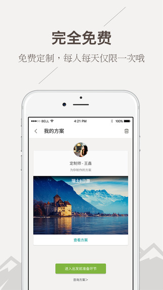 定制旅行,只玩你想玩的。旅行君的定制旅行理念,就是让旅行只玩你想玩的。